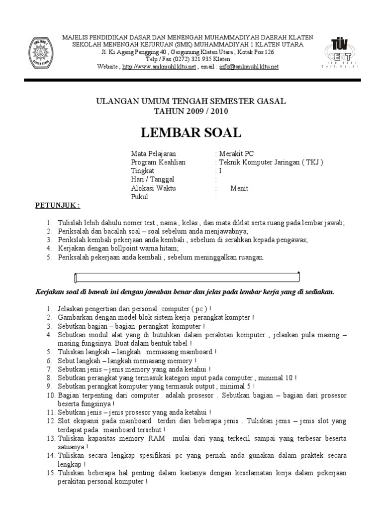 Buat teman2 yang sedang kebingungan mencari contoh soal sitem komputer untuk referensi dalam menghadapi ujian mata pelajaran produktif jurusan tkj ataupun yang lainnya, mudah2an ini bisa sedikit membantu dalam proses pembelajarannya. Bagaimana menurut anda tingkat kepercayaan masyarakat indonesia terhadap transaksi elektronik dengan menggunakan media website? Saya akan memberikan sedikit gambaran mengenai apa itu sistem komputer.mengenal apa itu sistem. Soal sistem komputer debby arie yuliantini xi tkj c stemanika i. 20 soal tkj beserta jawaban essay.